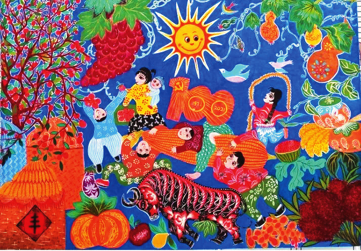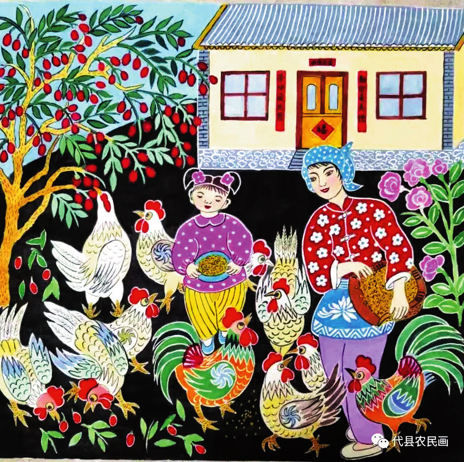 王粉玲《綠色家園》 她們的作品,取材于農(nóng)村、農(nóng)業(yè)、農(nóng)民生活,或表現(xiàn)美好的生活場景,或反映豐收的喜悅,或體現(xiàn)鄉(xiāng)愁,在表現(xiàn)手法上采用大膽的夸張、變形,巧用艷麗的色彩,人物刻畫細(xì)致入微,內(nèi)心喜悅躍然紙上,富有鮮明的地方特色。綜觀她們的作品,無不展現(xiàn)了社會主義新農(nóng)村在新時代的新變化、新風(fēng)貌,在傳承和弘揚(yáng)代縣文化、引領(lǐng)社會主義精神文明建設(shè)方面做出了出色的嘗試與實(shí)踐。