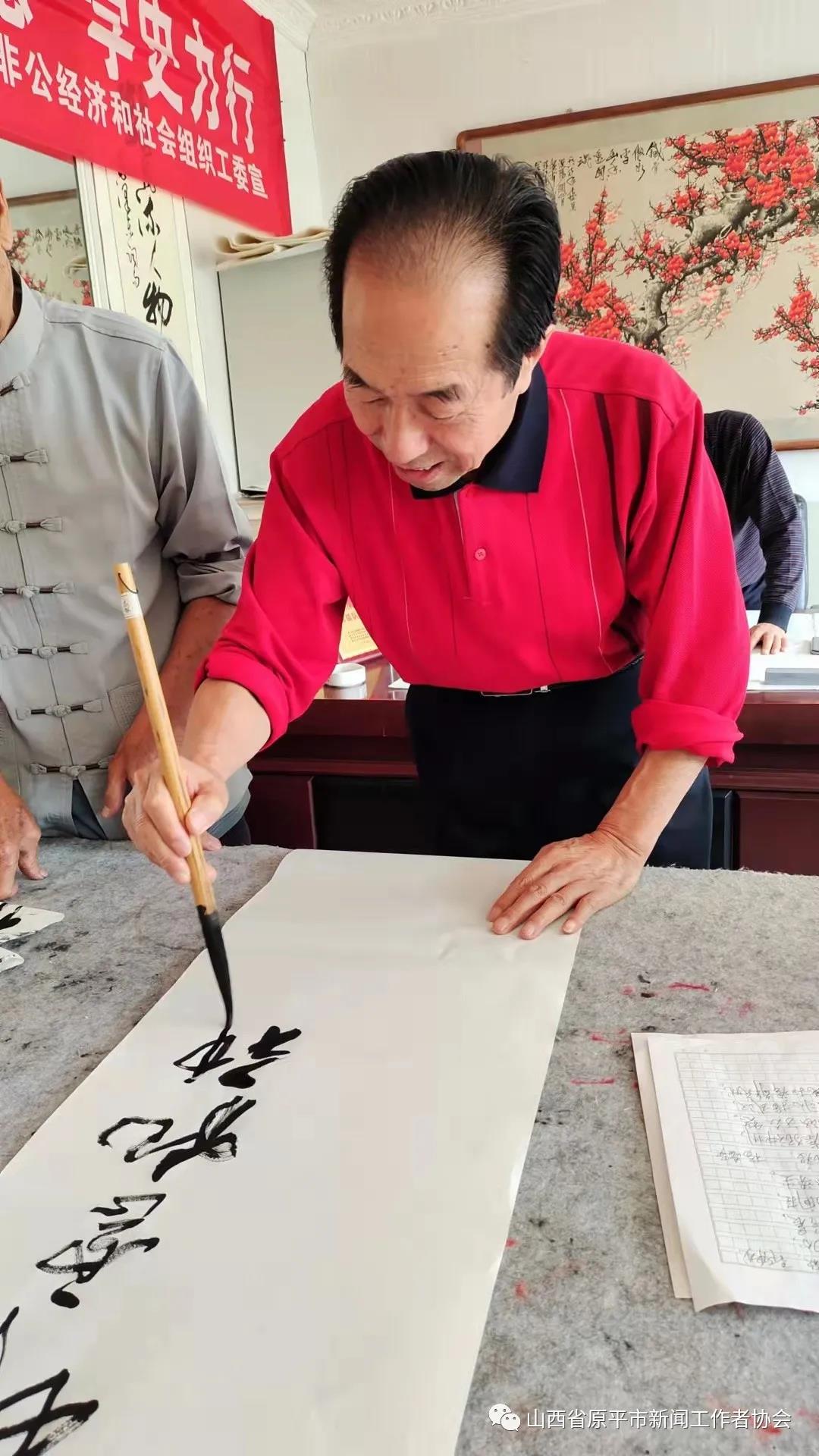 活動現(xiàn)場,大家暢所欲言,紛紛聯(lián)系思想實(shí)際,交流了學(xué)習(xí)黨史、明理知進(jìn)的心得體會,圍繞學(xué)史長知、學(xué)史明理、學(xué)史增信、學(xué)史興業(yè)進(jìn)行了熱烈討論。接著,書畫藝術(shù)組的書法家亢銀中、趙存仁、王玉伍、張正山、王福歲、王弘新,及學(xué)會顧問書畫名家溫樹森老師、以及特邀書畫名家李晉復(fù)先生,紛紛揮毫潑墨,書寫出學(xué)習(xí)黨史的感悟與名言。大筆揮灑中,一幅幅寫有“賡續(xù)精神血脈、傳承紅色基因”“明理增信.崇德力行”“不忘初心、牢記使命”和“江山就是人民、人民就是江山”等字樣的真、草、隸、篆、行書藝作品,從筆下飄然而出。墨香中呈現(xiàn)出各有千秋、韻味感人的風(fēng)格,博得觀賞者們的點(diǎn)贊稱道,并爭相拿到一幅贈品。書法家們顧不上喝水,整整忙了一個上午。特別是書畫藝術(shù)組組長李文光,由于平時在廣州忙于接送孩子上學(xué),放暑假回原平后特地趕來,高興地跟大家一起切磋書藝、展示才藝。書法家們還探討了書法藝術(shù)融入社會、融入黨性、服務(wù)大眾、服務(wù)中心的蹊徑、舉措與打算。(賈宣生 王福歲)