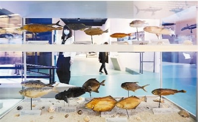 圖為參觀者在海洋展區(qū)一個魚類標(biāo)本展柜前駐足觀看。新華社記者 方 喆攝