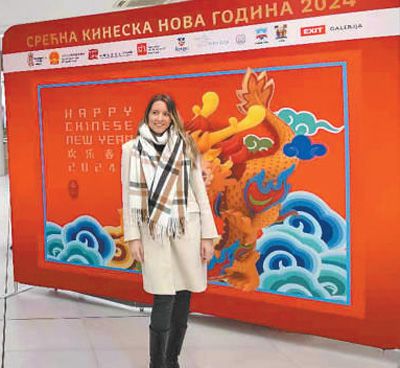 1月30日,在塞爾維亞諾維薩德,一位女士在“歡樂春節(jié)”活動(dòng)展板前留影。本報(bào)記者 謝亞宏攝