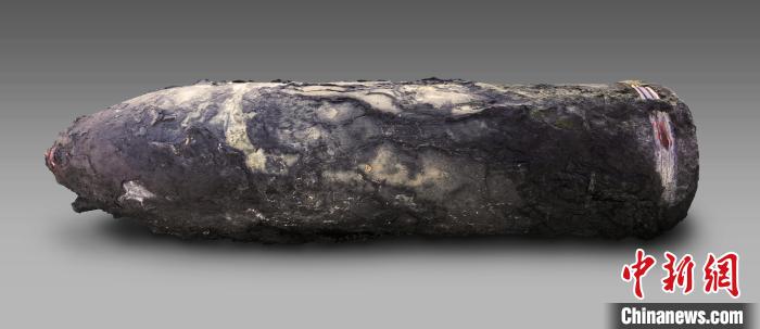 “靖遠(yuǎn)”艦遺址發(fā)掘出水的210MM口徑克虜伯炮彈。山東省水下考古研究中心供圖