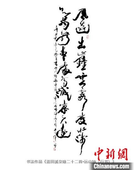 此次參展的《藍(lán)田溪雜詠二十二首·遠(yuǎn)山鐘(行書)》是韓天衡精心創(chuàng)作的書法作品。他深入感受古詩的韻律和意境,將詩意融入筆墨之中,作品筆勢流暢、氣韻生動,展現(xiàn)了漢字的靈動之美與深厚的文化底蘊。