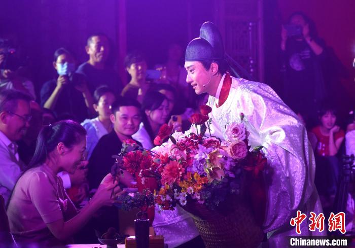 圖為“宋詞里的福建”沉浸式戲劇演出現(xiàn)場(chǎng)的演員與觀眾互動(dòng)。 中新網(wǎng)記者 呂明 攝