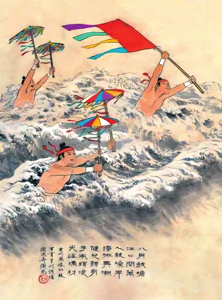 能在大江大河中搏擊風(fēng)浪的游泳好手,被人們尊稱為“弄潮兒”。唐人李益曾作閨怨詩(shī)《江南曲》:“嫁得瞿塘賈,朝朝誤妾期。早知潮有信,嫁與弄潮兒?!蹦纤五X塘江弄潮是一大盛事,“浙江之潮,天下之偉觀也”。在“大聲如雷霆,震撼激射,吞天沃日,勢(shì)極雄豪”的潮水中,數(shù)百名弄潮兒“皆披發(fā)文身,手持十幅大彩旗,爭(zhēng)先鼓勇,溯迎而上,出沒于鯨波萬(wàn)仞中,騰身百變,而旗尾略不沾濕,以此夸能”。辛棄疾夸他們“不怕蛟龍怒。風(fēng)波平步。看紅旆驚飛,跳魚直上,蹙踏浪花舞”,潘閬更是贊嘆“弄潮兒向濤頭立,手把紅旗旗不濕”。