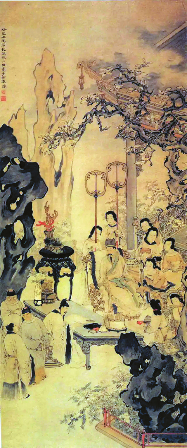 唐人李濬的《松窗雜錄》載,李白在長安任翰林待詔時(shí),一日宮中牡丹綻放,唐玄宗與楊貴妃前往賞花,找來李龜年等人奏樂歌唱。但玄宗看了歌單,覺得都是些過氣的舊曲子,配不上眼前的名花美女,就讓李龜年趕快去找李白填新詞。當(dāng)時(shí)李白宿醉未醒,趁著酒力秉筆賦詞,當(dāng)場寫就三首《清平調(diào)》歌頌楊貴妃的美貌。待李龜年唱完,楊貴妃很高興,還親自領(lǐng)唱了這三首歌。唐玄宗也吹著玉笛伴奏,由此奠定了李白在盛唐詩壇“一哥”的重要地位。李白創(chuàng)作樂府詩的事情被收入《舊唐書》:“玄宗度曲,欲造樂府新詞,亟召白,白已臥于酒肆矣。召入,以水灑面,即令秉筆,頃之成十余章,帝頗嘉之?!边@段關(guān)于李白的佳話,在中國詩歌史上留下濃墨重彩的一筆。