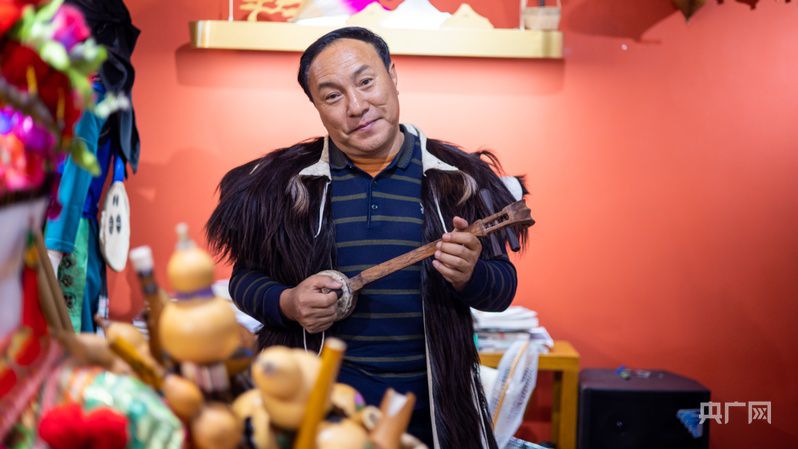 字汝民捧著彝族小三弦(央廣網記者 魏文青 攝)