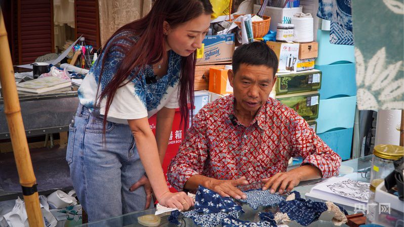 熊天艷和父親熊文杰在討論扎染紋樣(央廣網記者 魏文青 攝)