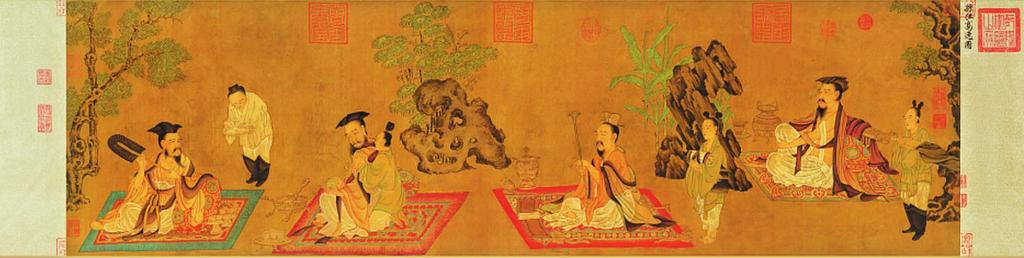 花鳥畫發(fā)端更晚,魏晉隋唐時期,尚未形成獨立的畫科,往往于人物、山水中作為襯景出現(xiàn)。不過正是這些襯景的描繪,成為日后花鳥門類形成與發(fā)展的基礎。如唐代孫位《高逸圖》,樹木、湖石、芭蕉的畫法已成熟,一旦從人物畫背景中脫離出來,便足以獨立成科了。因此,五代以后花鳥畫蓬勃發(fā)展,是水到渠成之事。
