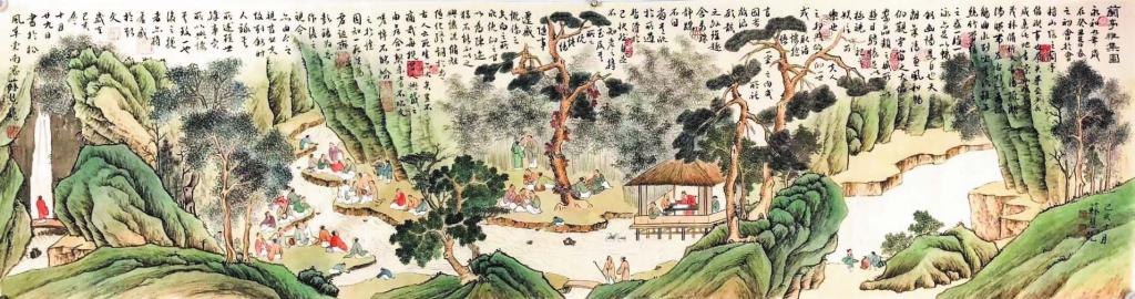 東晉永和九年(353年)上巳節(jié),會(huì)稽內(nèi)史王羲之和謝安、孫綽等人在山陰蘭亭修禊,曲水流觴,飲酒賦詩(shī),所作詩(shī)歌后來結(jié)集為《蘭亭集》,王羲之為之撰序,即被稱作“天下第一行書”的《蘭亭序》,而蘭亭雅集的詩(shī)酒風(fēng)流也成為千古佳話。在后世仿效的各類蘭亭雅集中,詩(shī)歌、繪畫、書法等多種藝術(shù)元素爭(zhēng)奇斗艷,形成華麗精致、傳承千載的文化景觀。