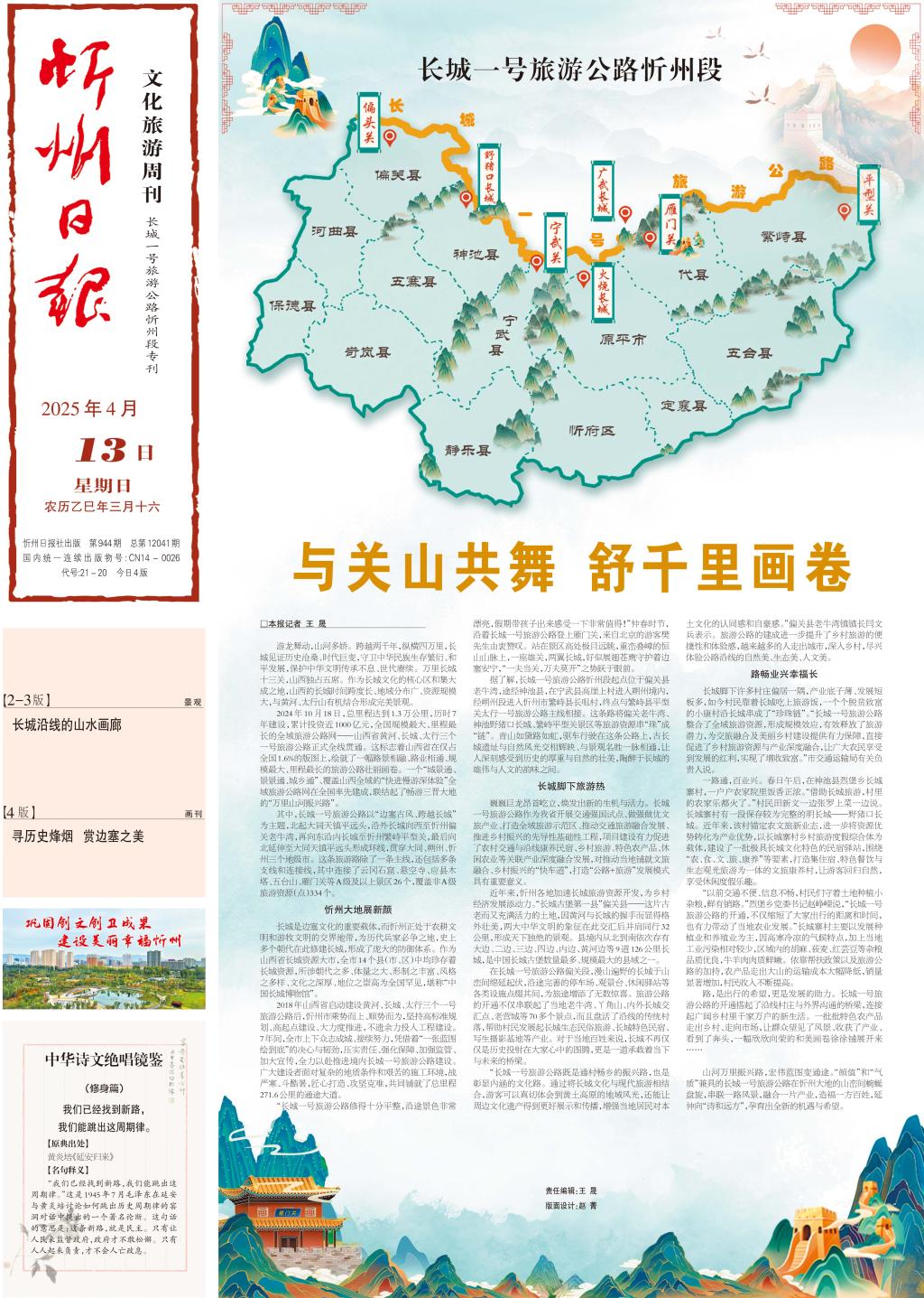 山河萬里振興路,宏偉藍(lán)圖變通途?!邦佒怠焙汀皻赓|(zhì)”兼具的長城一號旅游公路在忻州大地的山巒間蜿蜒盤旋,串聯(lián)一路風(fēng)景,融合一片產(chǎn)業(yè),造福一方百姓,延伸向“詩和遠(yuǎn)方”,孕育出全新的機(jī)遇與希望。(記者 王 晟)