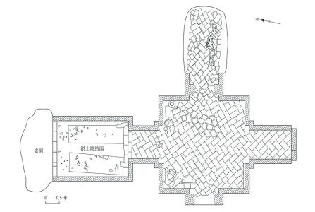 而M27獨居?xùn)|區(qū),間距達100余米,與前兩墓形成鮮明反差,墓磚無任何涂紅,隨葬品僅見素面灰陶罐、陶碗,東漢常見釉陶禮器(耳杯、案、盤等)完全消失,墓道呈“口小底大”特殊結(jié)構(gòu),墓室西北角設(shè)灶,突破同期墓葬的空間布局傳統(tǒng)。