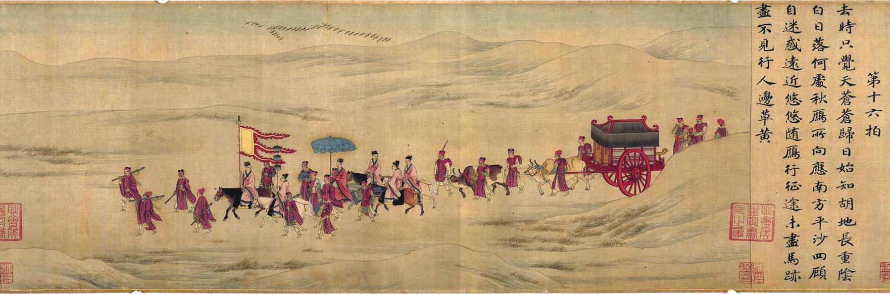 通過(guò)出土和存世的一些圖像,我們可以一窺漢代旄節(jié)之真容。洛陽(yáng)燒溝61號(hào)西漢壁畫墓中的壁畫磚上繪有一持節(jié)使者;山東嘉祥武氏祠一組畫像中,描繪了漢使持節(jié)拜見(jiàn)王陵之母的場(chǎng)景,手中所持之節(jié)正是旄三重,只是看起來(lái)柄長(zhǎng)不到八尺。至于“旄節(jié)之制”,漢代與先秦當(dāng)是有別的,將旄牛尾編成三重流蘇的制節(jié)之法始于漢,《事物紀(jì)原》載:“漢人有持節(jié),乃古旄也。然則節(jié)自周始,而旄節(jié)則起于漢也?!边@種持節(jié)使的形象,在南宋人所繪《胡笳十八拍》和《迎鑾圖》等表現(xiàn)外交題材的畫作中,仍有清晰體現(xiàn),可見(jiàn)這種持節(jié)出使的制度在古代一直延續(xù)。