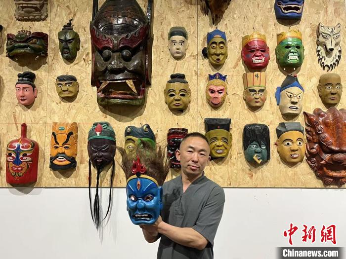 5月4日,湖北恩施州級非物質(zhì)文化遺產(chǎn)儺面具制作技藝代表性傳承人汪儒斌展示他做的儺面具。中新社記者 武一力 攝