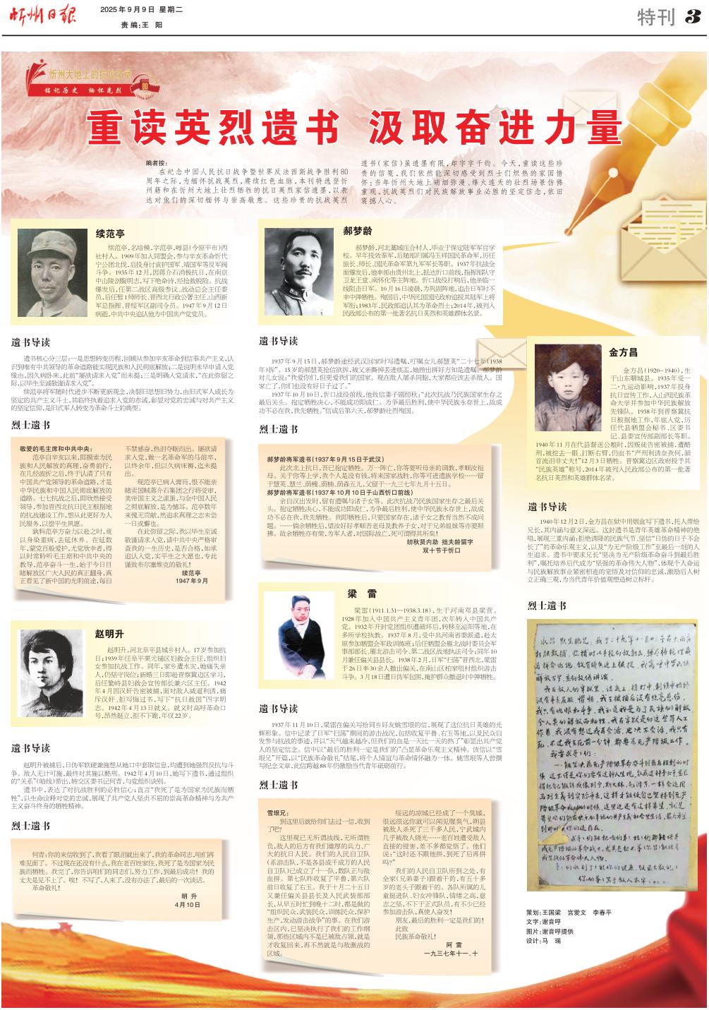在紀(jì)念中國人民抗日戰(zhàn)爭暨世界反法西斯戰(zhàn)爭勝利80周年之際,為緬懷抗戰(zhàn)英烈,賡續(xù)紅色血脈,本刊特選登忻州籍和在忻州大地上壯烈犧牲的抗日英烈家信遺墨,以表達(dá)對他們的深切緬懷與崇高敬意。這些珍貴的抗戰(zhàn)英烈遺書(家信)雖遺墨有限,卻字字千鈞。今天,重讀這些珍貴的信箋,我們依然能深切感受到烈士們熾熱的家國情懷:當(dāng)年忻州大地上硝煙彌漫、烽火連天的壯烈場景仿佛重現(xiàn),抗戰(zhàn)英烈們對民族解放事業(yè)必勝的堅(jiān)定信念,依舊震撼人心。