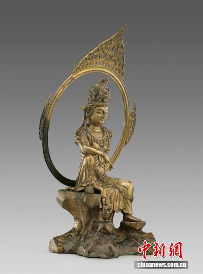 中新網(wǎng)金華9月17日電(董易鑫 孫媛媛)高53厘米,整尊觀音頭戴高冠,冠上飾化佛,身佩瓔珞,左臂撐巖,右臂置膝,左腿下垂,右腿上曲足踏巖石,安坐于山巖之上,身旁石上置一凈瓶,身后一圓輪狀大背光,渾圓精美,邊緣裝飾火焰紋,仿佛巖前有潺潺流水,觀音目觀水中月影——這是68年前出土于浙江金華萬(wàn)佛塔地宮的五代鎏金銅觀音造像,也叫作“水月觀音”,是國(guó)家一級(jí)文物,現(xiàn)藏于中國(guó)國(guó)家博物館。