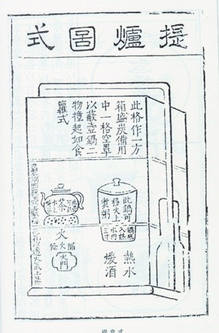 明代戲曲家高濂編撰的《遵生八箋》,可謂士大夫精致生活的指導書,書中仔細介紹了提爐的形制與結構,還附上了插圖。書云:“式如提盒,亦余制也。高一尺八寸,闊一尺,長一尺二寸,作三撞。下層一格,如方匣,內用銅造水火爐,身如匣方,坐嵌匣內。中分二孔,左孔炷火,置茶壺以供茶;右孔注湯,置一桶子小鑊有蓋,頓湯中煮酒。長日午余,此鑊可煮粥供客。傍鑿一小孔,出灰進風。其壺鑊迥出爐格上,太露不雅,外作如下格方匣一格,但不用底以罩之,便壺鑊不外見也。一虛一實共二格,上加一格,置底蓋以裝炭,總三格成一架,上可箾關,與提盒作一副也。”