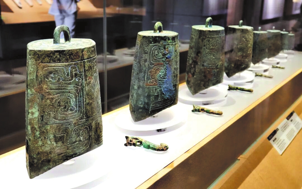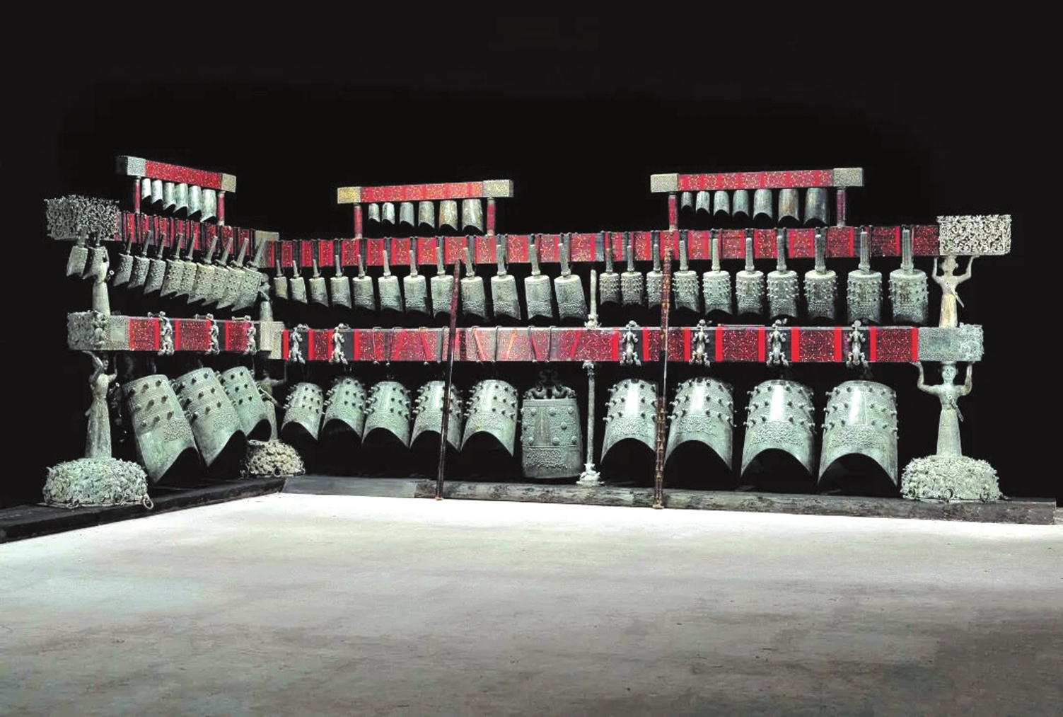 最具代表性的樂鐘無疑是“青銅之冠”的曾侯乙編鐘,它展現(xiàn)了先秦禮樂文明與青銅鑄造技術(shù)的最高成就。曾侯乙編鐘是戰(zhàn)國早期曾國國君的“禮樂重器”,1978年出土于今湖北隨州的曾侯乙墓,是迄今發(fā)現(xiàn)數(shù)量最多、保存最好、音律最全、氣勢最宏偉的一套編鐘,共65件,分3層8組懸掛于彩漆鐘架之上,鐘體總重達(dá)2.5噸。整套編鐘低音渾厚、中音圓潤、高音清脆,音域?qū)拸V,而且中心音域內(nèi)半音齊備,可以旋宮轉(zhuǎn)調(diào),演奏各種音樂。1978年8月1日,沉寂了2400多年的曾侯乙編鐘演奏了《東方紅》《國際歌》和古曲《楚殤》、民族歌曲《草原上升起不落的太陽》等各種樂曲,樂音悠揚(yáng)回蕩。