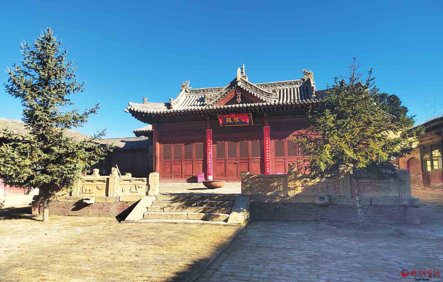 一進院布局,中軸線現(xiàn)存有正殿1棟,兩側(cè)建有配殿,西北角建有偏殿。正殿磚砌臺基,面寬五間,進深六椽,七檁前后廊式構(gòu)架,前檐斗拱為五踩,后檐為三踩斗拱,單檐懸山頂。前設月臺,建有抱廈三間,單檐歇山頂?,F(xiàn)新塑像3尊,正殿梁架有彩繪。