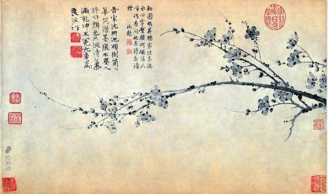 王冕《墨梅圖》是元代梅花題材繪畫的代表作,既展現(xiàn)了文人的傲然風骨,亦革新了北宋以來的梅花筆法。與眾多畫家筆下的“官梅”相比,王冕更喜愛以“野梅”入題,這或許因為“野梅”的風骨更為突出,也更能寄托畫家對自由的追逐。王冕筆下的墨梅擺脫了枯燥外形與彎曲枝蔓的束縛,彰顯不凡的氣度與精神。清人朱方靄在《畫梅題記》中說:“宋人畫梅,大都疏枝淺蕊,至元煮石山農(王冕的號)始易以繁花,千叢萬簇,倍覺豐神綽約,珠胎隱現(xiàn),為此花別開生面。”