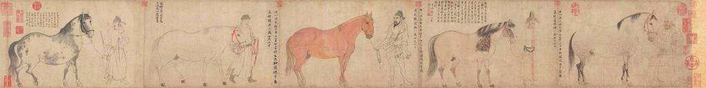 《五馬圖》以白描的手法畫了五匹名馬,依次為鳳頭驄、錦膊驄、好頭赤、照夜白、滿川花。每匹馬均有一個(gè)人牽引,其中兩人著西域服裝、三人穿漢人衣服,人馬均以單線勾勒,流暢而內(nèi)斂,反映出高超的白描技藝。