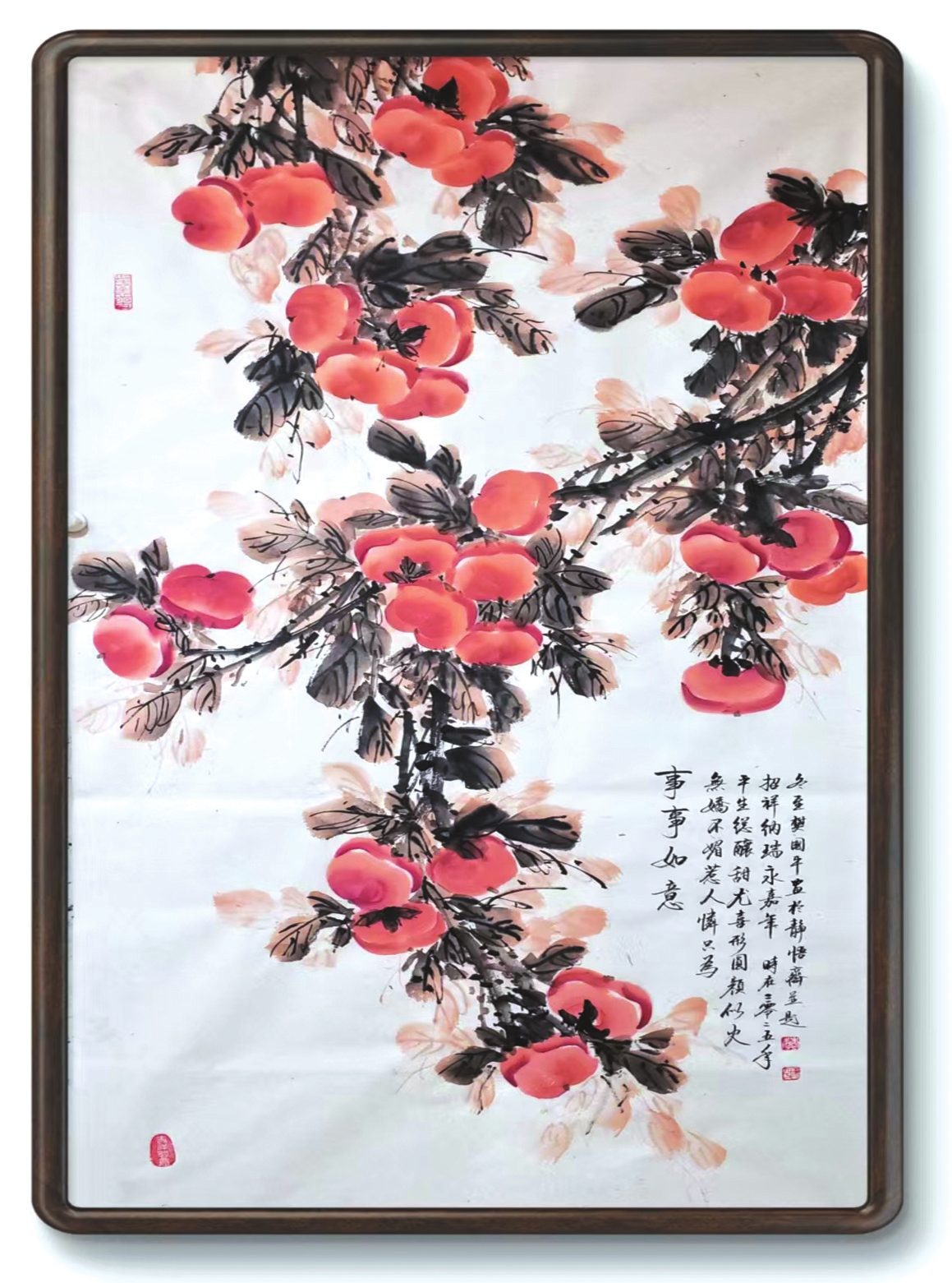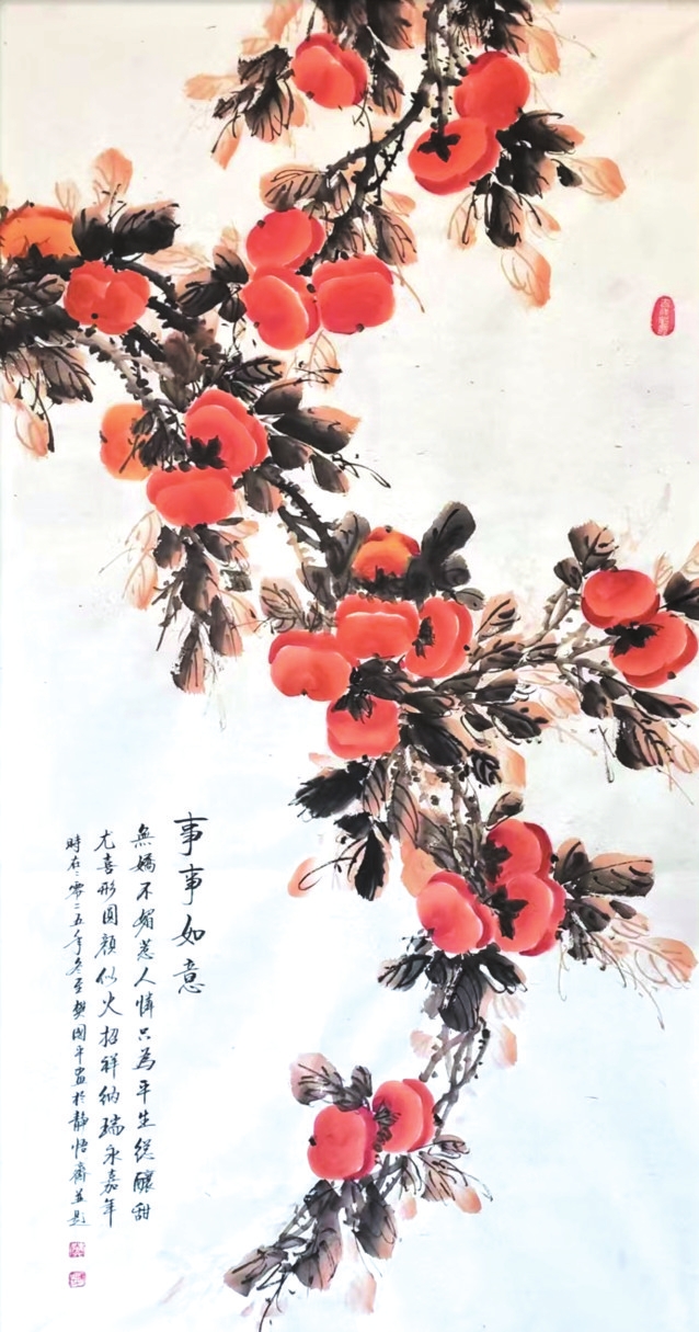 在樊國平眾多題材探索中,《事事如意》系列柿子圖可謂其藝術(shù)精神與人生哲思的縮影。這些作品超越了尋?;B畫的怡情悅性,成為她寄托情懷、叩問生命的重要載體。畫中那一串串、一簇簇丹柿,色澤溫潤,形態(tài)豐盈,承載著諧音“事事如意”的吉祥寓意,滿足了社會對美滿生活的樸素祈愿。她以此通俗意象為入口,引領(lǐng)觀者步入一個融匯儒、道、佛哲學理念的深邃境界,實踐著中國藝術(shù)“技進乎道”“以畫載道”的至高追求。