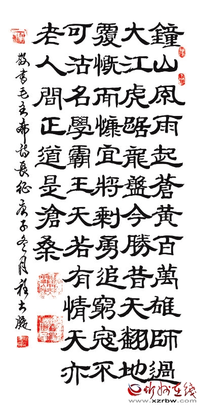 二是程老有真功。他一人能熟練書寫甲骨、篆書、魏碑、曹全隸、乙瑛隸、章草、歐柳楷、顏趙楷、行楷、行書、行草、草書、伊秉綬隸、創(chuàng)新粗圓、創(chuàng)新仿宋、創(chuàng)新大黑、創(chuàng)新角篆、仿毛體18種書體(見圖)。還會(huì)畫畫寫詩(shī),詩(shī)書畫樣樣精通。對(duì)程大凝而言,臨帖是他最大的快樂,創(chuàng)作是他最大的滿足?,F(xiàn)在他的工作室有4000多幅作品。退休后參加全國(guó)性書法大賽就獲獎(jiǎng)300余次。