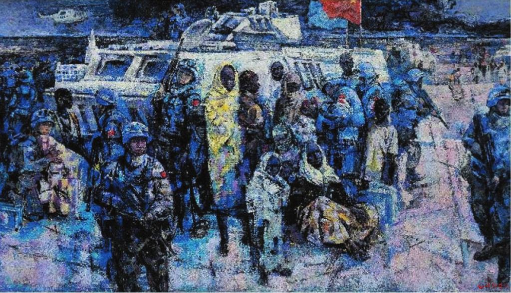 在續(xù)鶴賢眾多的作品中,從畫(huà)面表現(xiàn)效果方面,我是比較喜歡《和平使命——藍(lán)色交響曲》這幅作品的。無(wú)論畫(huà)面構(gòu)圖、色彩關(guān)系,還是人物造型以及表現(xiàn)技巧,都堪稱完美。畫(huà)面中無(wú)論人物形象、動(dòng)態(tài)、表情,還是人與自然背景,都處在一種和諧美好的關(guān)系中,從一個(gè)新的角度給予美好詮釋。這幅作品表現(xiàn)的是我們的維和部隊(duì)“子弟兵”以自己的生命守護(hù)著世界和平,講述著構(gòu)建人類命運(yùn)共同體的大國(guó)情懷。 (邢晨聲 文)