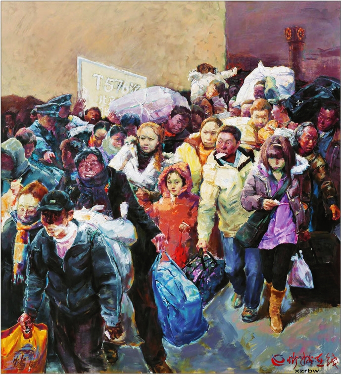 《春潮——回家過(guò)年》這幅作品是典型、真實(shí)的社會(huì)現(xiàn)實(shí)和人性本真的寫(xiě)照,這個(gè)瞬間定格了一段讓多少人刻骨銘心的記憶,敘述了周期性的人類大遷徙——春運(yùn)。該畫(huà)所蘊(yùn)涵的是中國(guó)人心中那份最飽滿的希望。旅客是彼此都不認(rèn)識(shí)的陌生人,為了一個(gè)回家的目的,毫無(wú)距離地?cái)D在一起,人物個(gè)性鮮明。畫(huà)家具有強(qiáng)大的創(chuàng)作能力和藝術(shù)表現(xiàn)力。(邢晨聲 文)