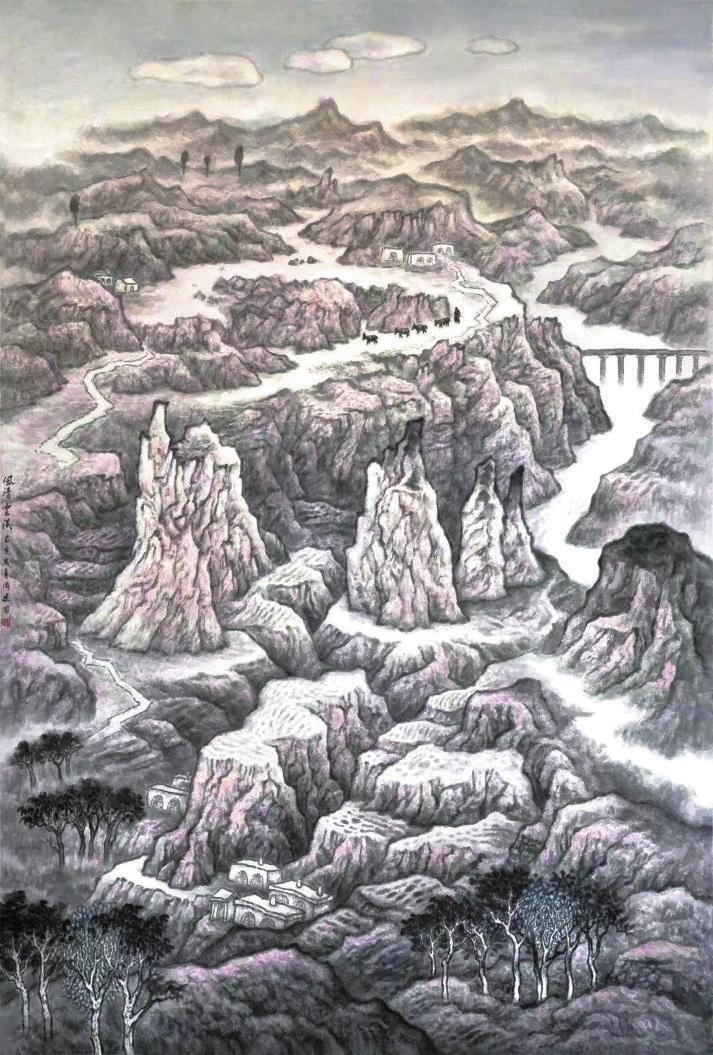周建國對中國山水畫有著獨(dú)特見解,出版過畫集《中國美術(shù)名家精品鑒賞·周建國作品集》。他的創(chuàng)作之路主要分為兩個(gè)時(shí)期,前期追求中西融合,后期則回歸傳統(tǒng)。前期作品《曉月》《古原除夕》《月色》等,多取材于黃土高原,真切流露出其對黃土地的深情厚愛:早上飄起的炊煙演繹著百姓的勤勞,喧鬧的腰鼓彰顯著鄉(xiāng)民熱愛生活的豪情,晨起上課的學(xué)生更是承載著當(dāng)?shù)厝藵M滿的希望。周建國將黃土地上的一草一木皆升華為獨(dú)特且富有個(gè)性的生命體,畫面處理側(cè)重將西方油畫的光影巧妙融入作品,寓動于靜,動靜相宜,彰顯“高貴的單純,靜穆的偉大”的內(nèi)在張力。同時(shí)將傳統(tǒng)山水繪畫的造型、空間結(jié)構(gòu)、筆法設(shè)色皆進(jìn)行改變——黃土溝壑的幾何化處理、筆墨色調(diào)的反復(fù)拿捏、耐人尋味的空間布局,都體現(xiàn)了其特殊的創(chuàng)作理念。相較前期,周建國后期的作品更加注重對內(nèi)在美的挖掘,如《風(fēng)月同天》《家園》《和諧家園》《生息之地》《太行月色》等代表作品,表達(dá)對祖國山河大川的熱愛,走“外師造化,中得心源”之道,畫風(fēng)趨向率真,試圖突破中國山水繪畫的表象審美,追尋深層意義的表達(dá)。