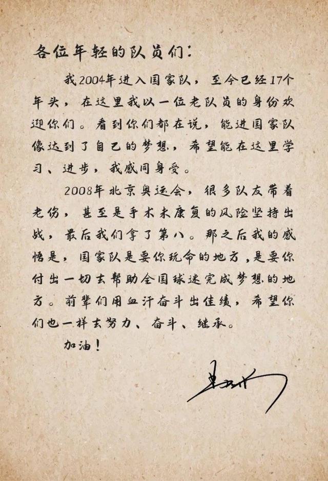易建聯(lián)在信中回顧了自己首次入選國家隊的感受,表示自己完全能理解新隊員此刻的心情,他尤其強調(diào)了榮譽感與責(zé)任感,對這些小兄弟們說“國家隊是要你玩命的地方”,“各位年輕隊員們,我2004年進(jìn)入國家隊,至今已經(jīng)有17個年頭,在這里我以一位老隊員的身份歡迎你們。看到你們都在說,能進(jìn)國家隊像達(dá)到了自己的夢想,希望能在這里學(xué)習(xí)、進(jìn)步,我感同身受。2008年北京奧運會,很多隊友帶著老傷,甚至是手術(shù)未康復(fù)的風(fēng)險堅持出戰(zhàn),最后我們拿到了第八。那之后我的感悟是,國家隊是要你玩命的地方,是要你付出一切去幫助全國球迷完成夢想的地方。前輩們用血汗奮斗出佳績,希望你們也一樣去努力、奮斗、繼承。”