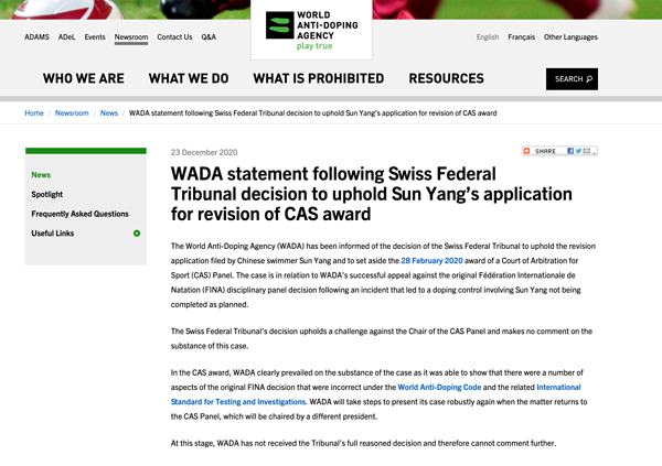 在得知瑞士最高法院撤銷對(duì)孫楊的裁決后,WADA對(duì)此事發(fā)表聲明稱,已得知瑞士聯(lián)邦最高法院支持孫楊對(duì)CAS判決的改判請(qǐng)求,會(huì)積極采取行動(dòng),在案件回到國際體育仲裁法庭后,繼續(xù)陳述其立場(chǎng)。聲明如下: