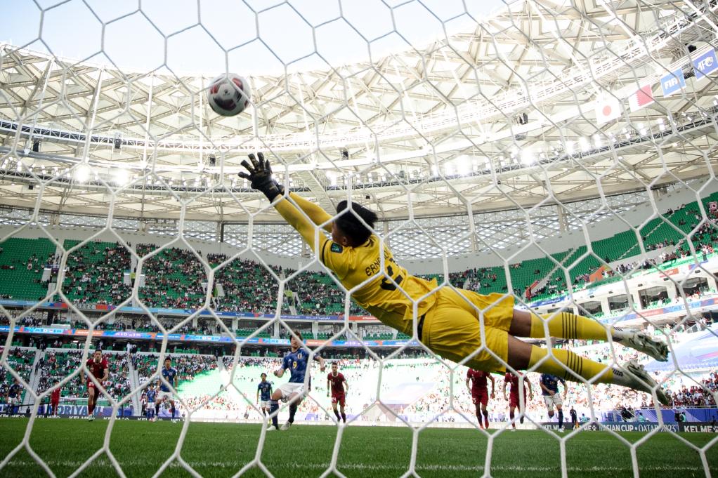 1月24日,印尼隊守門員埃爾南多·阿里·蘇塔爾亞迪(前)在比賽中未能撲出日本隊球員上田綺世的點(diǎn)球。新華社記者 江漢 攝