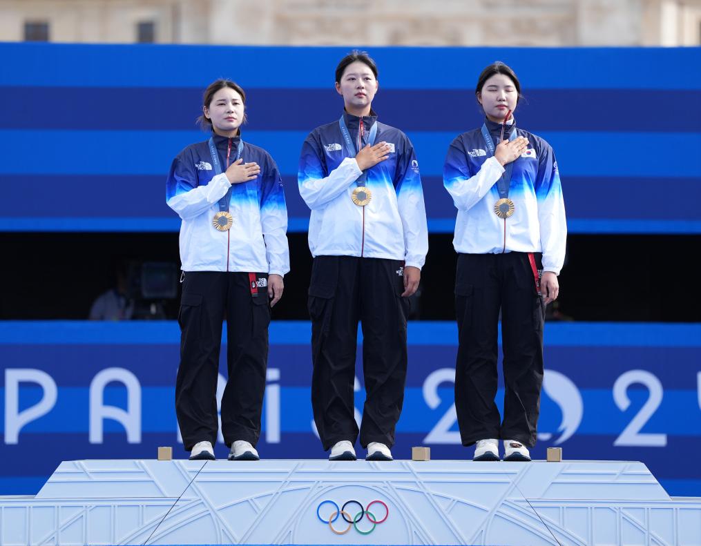 7月28日,冠軍韓國隊選手全勛英、林是見、南秀賢(從左至右)在頒獎儀式上。新華社記者 賀燦鈴 攝