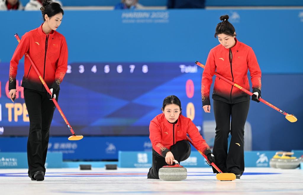 2月9日,中國隊(duì)選手韓雨(中)在比賽中擲壺。新華社記者 趙子碩 攝