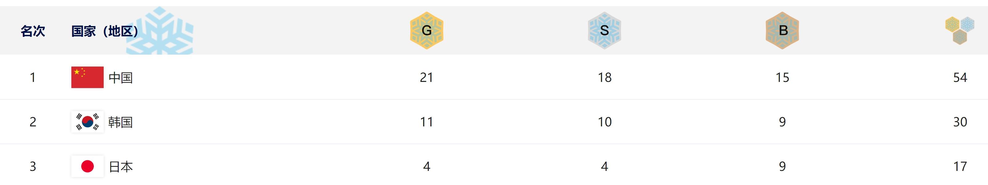 單日再奪6金,中國代表團(tuán)在本屆亞冬會已奪得21金18銀15銅,21金也創(chuàng)造了中國代表團(tuán)參加單屆亞冬會歷史最佳成績(此前為2007年長春亞冬會的19金)。韓國隊目前以11金10銀9銅排名獎牌榜第二,日本隊以4金4銀9銅排名第三。
