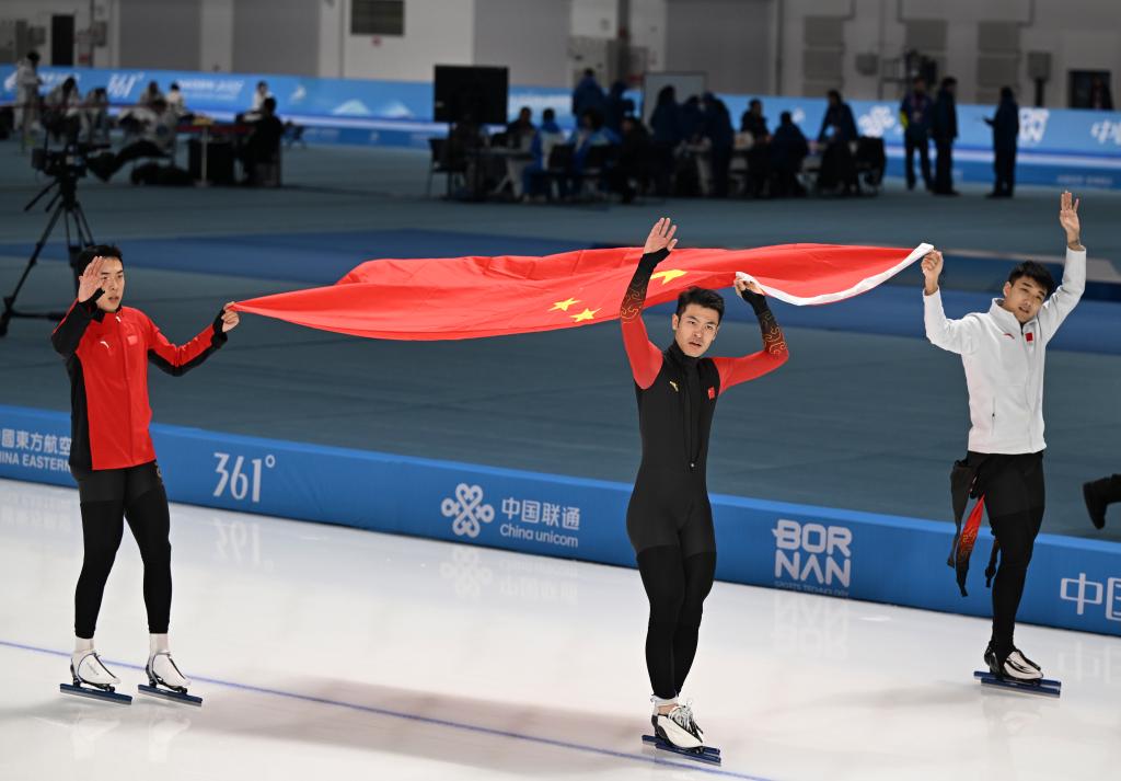 黑龍江省冰上訓(xùn)練中心速滑館里,《義勇軍進(jìn)行曲》三度奏響。當(dāng)日速度滑冰全部3枚金牌均被中國隊收入囊中。高亭宇先以0.02秒的微弱優(yōu)勢力壓日本選手森重航,奪得男子500米冠軍;又與隊友廉子文、寧忠?guī)r合作,奪得男子短距離團(tuán)體追逐金牌。女隊則又一次讓三面五星紅旗同時升起,楊濱瑜、韓梅、太智恩分獲女子3000米前三名。本屆亞冬會有三金入賬的高亭宇坦言不知道這會不會是自己最后一屆亞冬會,“(這次)我的關(guān)鍵詞是努力,相信大家一起努力,中國速度滑冰會越來越好”。