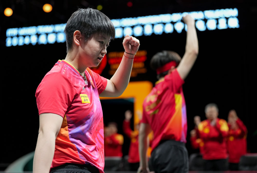2024年12月8日,中國隊組合王楚欽/孫穎莎(左)在得分后慶祝。當(dāng)日,在四川成都舉行的2024年成都國際乒聯(lián)混合團體世界杯決賽中,中國隊總比分8比1戰(zhàn)勝韓國隊,獲得冠軍。新華社記者 江宏景 攝