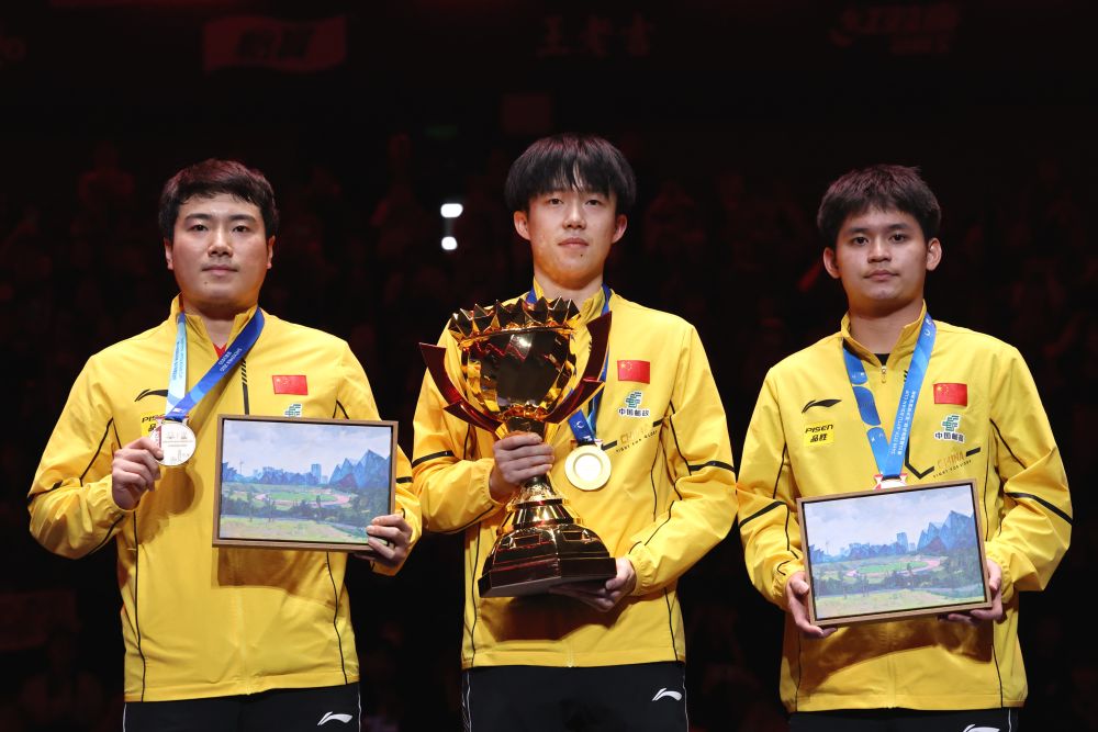 2月23日,冠軍王楚欽(中)、亞軍梁靖崑(左)和季軍林詩棟在頒獎儀式上合影。當(dāng)日,在廣東深圳舉行的第34屆國際乒聯(lián)-亞乒聯(lián)盟亞洲杯男子單打決賽中,中國選手王楚欽4比0戰(zhàn)勝隊友梁靖崑,奪得冠軍。新華社記者 梁旭 攝