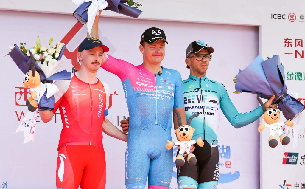 7月9日,賽段冠軍愛(ài)沙尼亞快客車(chē)隊(duì)車(chē)手拉亞斯·馬丁(中)、亞軍李寧之星車(chē)隊(duì)車(chē)手謝爾比·亞歷山大(左)、季軍意大利巴迪亞尼車(chē)隊(duì)車(chē)手扎農(nóng)塞洛·恩洛科在領(lǐng)獎(jiǎng)臺(tái)上合影。新華社記者 齊芷玥 攝