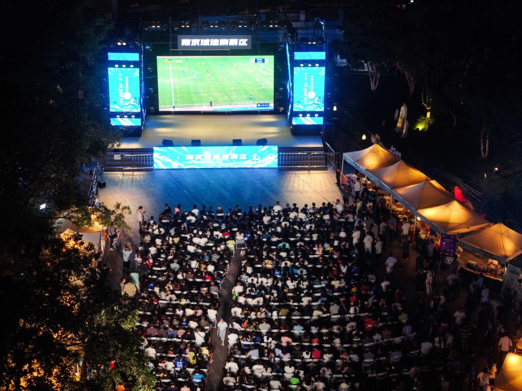 8月17日,球迷在南京一個(gè)露天屏幕前觀看2025江蘇省城市足球聯(lián)賽(“蘇超”)第九輪比賽。新華社記者 季春鵬 攝