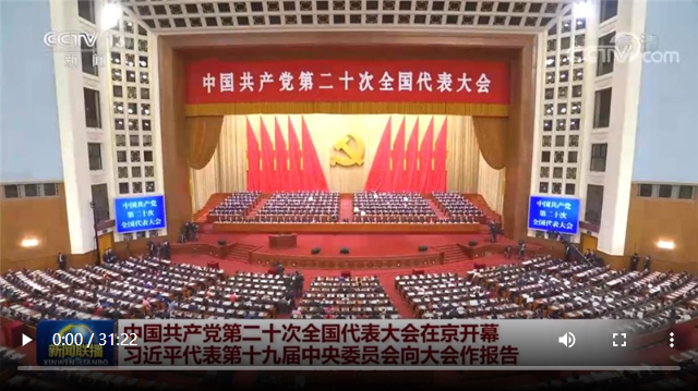 習近平代表第十九屆中央委員會向大會作了題為《高舉中國特色社會主義偉大旗幟 為全面建設社會主義現(xiàn)代化國家而團結奮斗》的報告。習近平指出,中國共產(chǎn)黨第二十次全國代表大會,是在全黨全國各族人民邁上全面建設社會主義現(xiàn)代化國家新征程、向第二個百年奮斗目標進軍的關鍵時刻召開的一次十分重要的大會。大會的主題是:高舉中國特色社會主義偉大旗幟,全面貫徹新時代中國特色社會主義思想,弘揚偉大建黨精神,自信自強、守正創(chuàng)新,踔厲奮發(fā)、勇毅前行,為全面建設社會主義現(xiàn)代化國家、全面推進中華民族偉大復興而團結奮斗。
