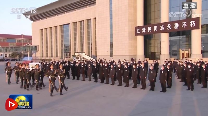 北京西郊機場國旗半垂,氣氛莊嚴(yán)肅穆,黑底白字橫幅上寫著:“江澤民同志永垂不朽”“江澤民同志永遠活在我們心中”。習(xí)近平和夫人彭麗媛等胸佩白花、臂戴黑紗,神情凝重地在停機坪肅立。