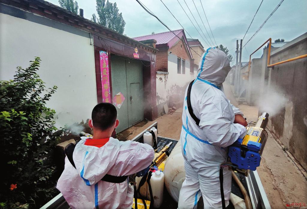 河北涿州發(fā)生暴雨洪澇災(zāi)害后,我市天龍救援隊響應(yīng)號召,攜帶專業(yè)救援設(shè)備迅速奔赴當?shù)鼐仍?,大家沖鋒在前,積極投入抽水、排污、清淤、搬運物資、消殺等工作中。圖為8月7日在該市刁窩鎮(zhèn),民盟盟員、救援隊隊員王宇龍(右一)和隊友在進行街巷消殺。(焦未軍攝)