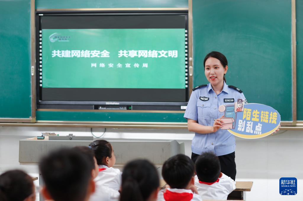 9月11日,公安民警在貴州省銅仁市玉屏侗族自治縣印山民族小學給學生講解網(wǎng)絡(luò)安全知識。(新華社發(fā) 胡攀學 攝)