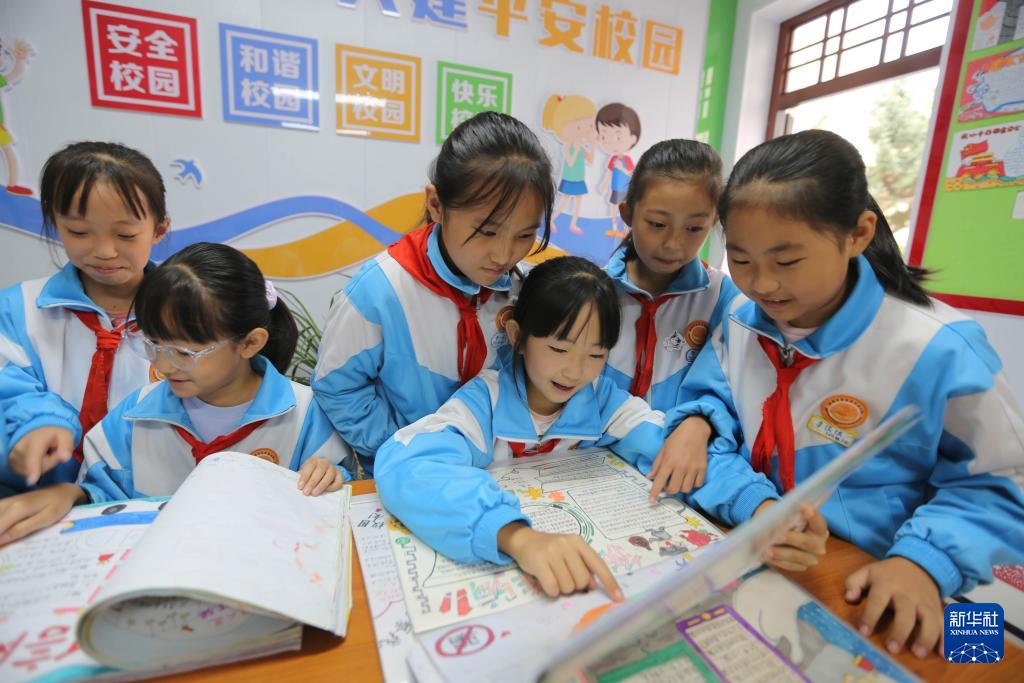 9月11日,甘肅省定西市安定區(qū)東關(guān)小學的學生利用手抄報學習網(wǎng)絡(luò)安全相關(guān)常識。(新華社發(fā) 王克賢 攝)