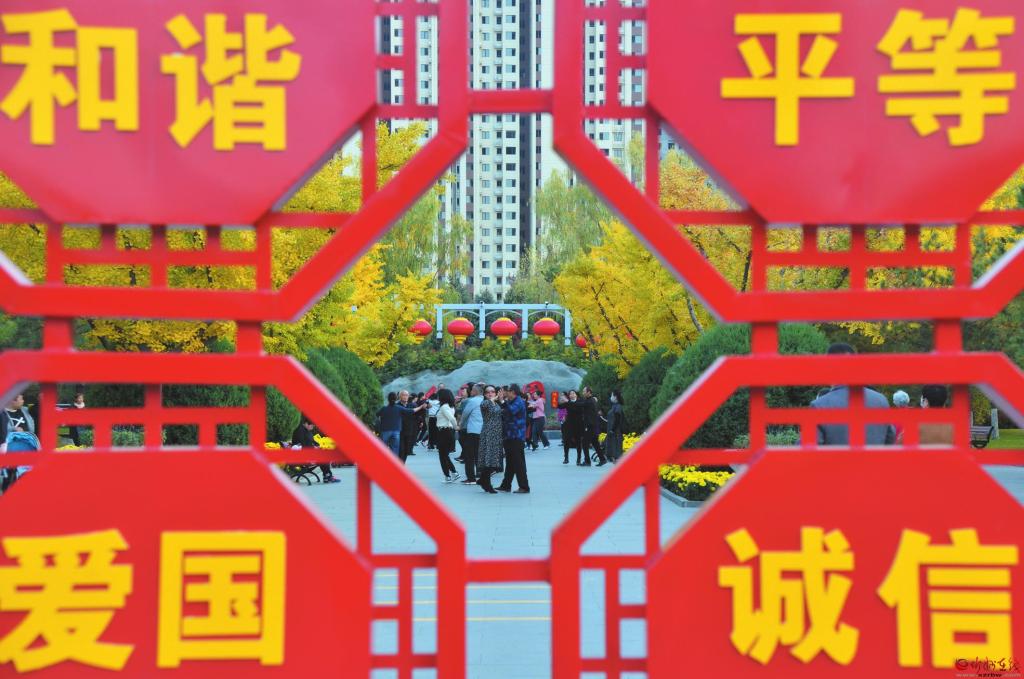 在我市中心城區(qū)的公園、廣場(chǎng)和城市綠地中,以社會(huì)主義核心價(jià)值觀、文明城市創(chuàng)建、優(yōu)秀傳統(tǒng)文化等為主題的宣傳展板、景觀造型隨處可見,在弘揚(yáng)傳統(tǒng)文化、傳播城市文明的同時(shí),給市民帶來視覺上的藝術(shù)享受,讓游客在游園賞景中受到熏陶。 (張存良 攝)