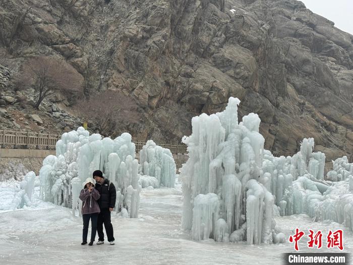 游客在賀蘭山巖畫景區(qū)內的冰瀑布景觀群打卡拍照。 中新網記者 李佩珊 攝