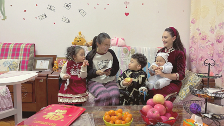 臨汾記者站記者郭玉琴(左二)在臨汾市水門(mén)街采訪“洋媳婦”扎拉過(guò)中國(guó)年。
