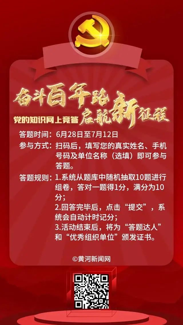 學(xué)習(xí)百年黨史,傳承紅色基因,汲取奮進(jìn)力量。為慶祝中國共產(chǎn)黨成立100周年,重溫黨的光輝歷程與偉大成就,扎實(shí)推動(dòng)黨史學(xué)習(xí)教育走深走實(shí),由山西省委網(wǎng)信辦指導(dǎo)、黃河新聞網(wǎng)承辦的【奮斗百年路 啟航新征程】黨的知識(shí)網(wǎng)上競答正式上線,邀您參與!