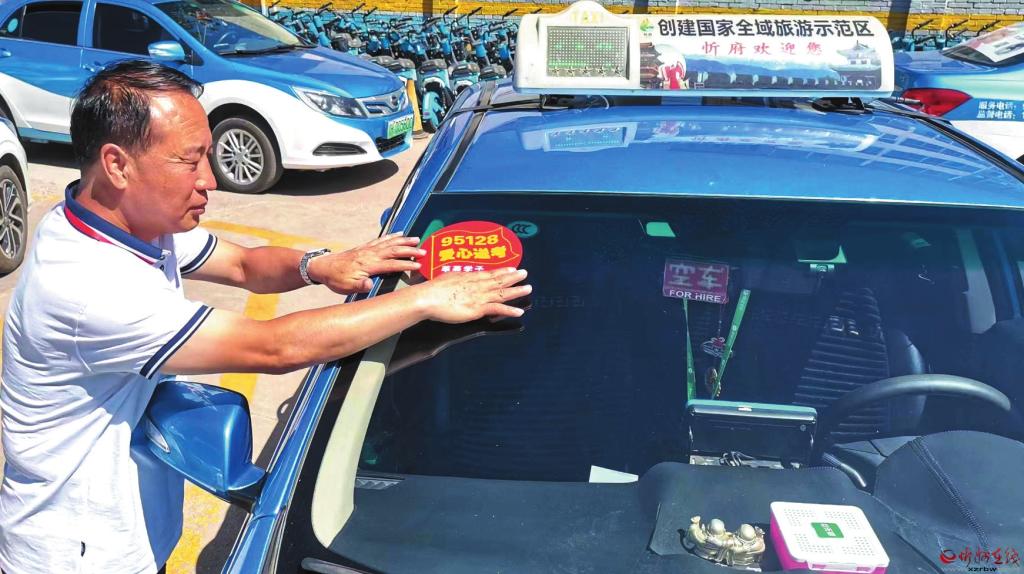 高考前夕,出租車司機(jī)在前擋風(fēng)玻璃上粘貼愛心送考標(biāo)識。 張林泉攝